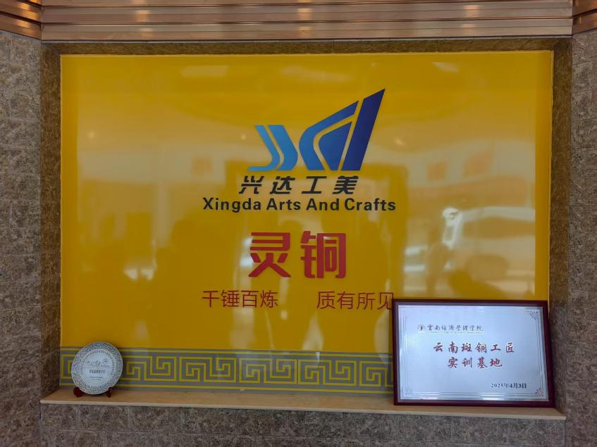 7月9日上午,本团队来到位于昆明市富民县的云南兴达工艺美术有限公司,开展了一场以“探寻非遗文化,感悟工匠精神”为主题的实践活动。此行旨在近距离了解国家级非物质文化遗产——云南斑铜的独特魅力及其在现代的传承与发展。云南兴达工艺美术有限公司获得过国家专利,并具有斑铜正规技艺传承、拥有生产专利权,其注册商标“孔雀牌”云南斑铜,荣获云南省著名商标、云南省名牌产品、云南省知名品牌。