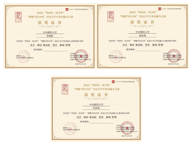 在2025“外研社·国才杯”“理解当代中国”全国大学生外语能力大赛英语组笔译赛项北京赛区比赛中,我校2024级会计学院本科生李雨虹、张欣然及任欣怡与来自北京市50余所高校的124名优秀选手同台竞技,最终三名同学斩获北京赛区笔译赛项铜奖。