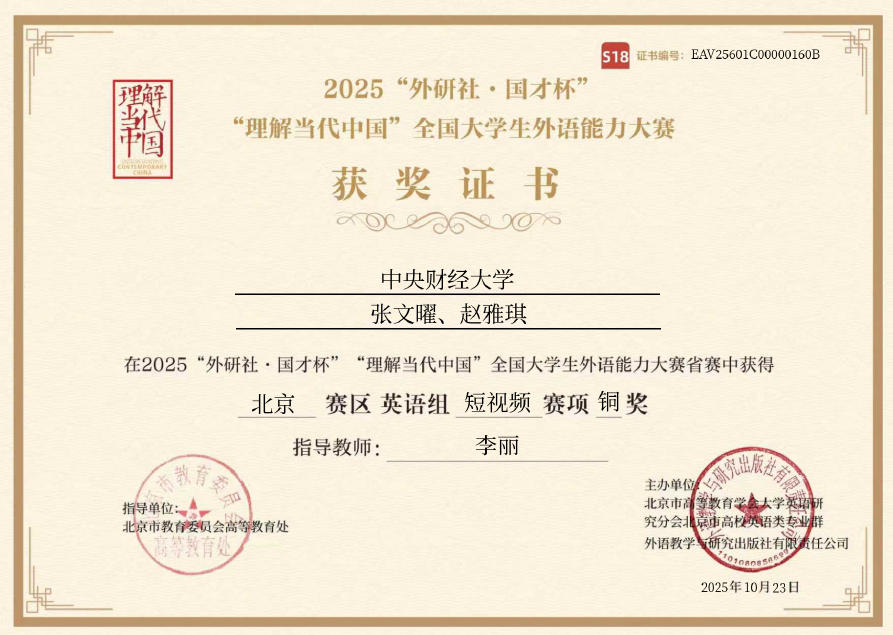 2025“外研社·国才杯”“理解当代中国”全国大学生外语能力大赛英语组短视频赛项题目为“美丽中国”。我校推选六个优秀团队中两个团队获得北京赛区银奖、三个团队获得铜奖。