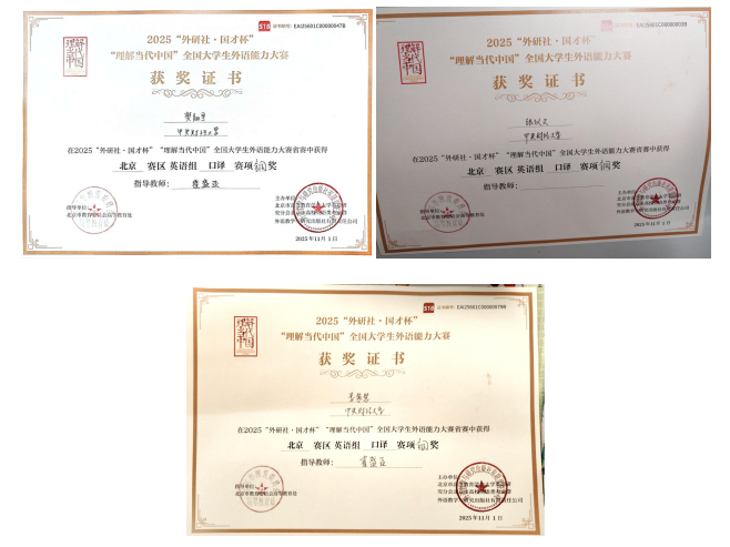 在2025“外研社·国才杯”“理解当代中国”全国大学生外语能力大赛英语组口译赛项北京赛区比赛中,我校2025级翻译硕士研究生李紫慧、2025级外国语言文学硕士研究生张议文、2023级计算机科学与技术本科生樊翔宇,与来自北京市30余所高校的82名优秀选手同台竞技,最终三位同学均获得北京赛区口译赛项铜奖。