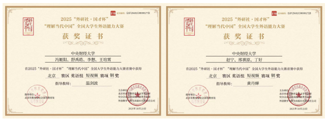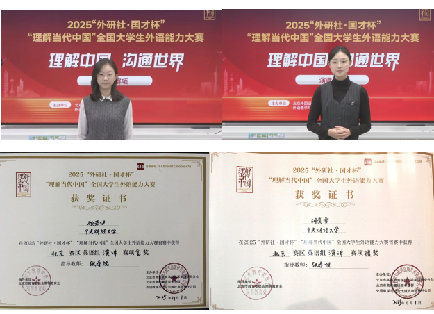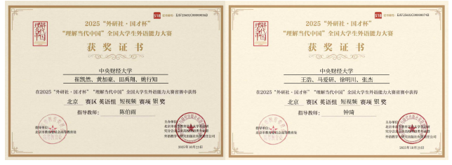 我校于9月24日举办中央财经大学2025年英语演讲比赛,经过线上初赛及线下复赛,推选优秀同学参加2025 “外研社·国才杯”“理解当代中国”全国大学生外语能力大赛英语组演讲赛项北京赛区比赛,我校2025级国际经济与贸易学院本科生顾芳伊、2024级管理科学与工程学院本科生胡奕雪,与来自北京市60所高校的选手,历时半个月线上定题演讲比赛及线下复赛的激烈角逐,最终分别斩获演讲赛项北京赛区金奖和银奖。