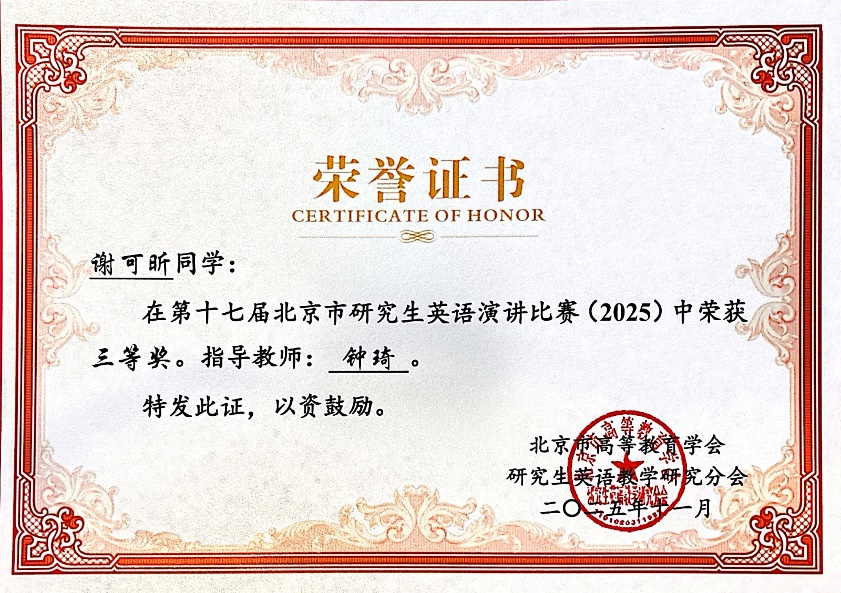 2025年11月22、29日,第十七届北京市研究生英语演讲比赛复赛在北京师范大学、北京邮电大学、首都医科大学和北京林业大学举行,本次比赛由北京市高等教育学会和北京市高等教育学会研究生英语教学研究分会主办。我校大学外语语言学习中心组织选派在校园选拔赛中脱颖而出的创新发展学院(中国经济与管理研究院)2025级研究生谢可昕代表我校参赛,与来自北京市35所高校的百余名优秀选手同台竞技,最终,谢可昕同学荣获北京市三等奖。