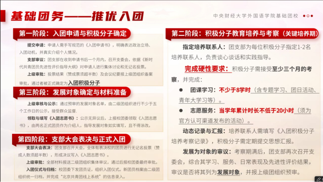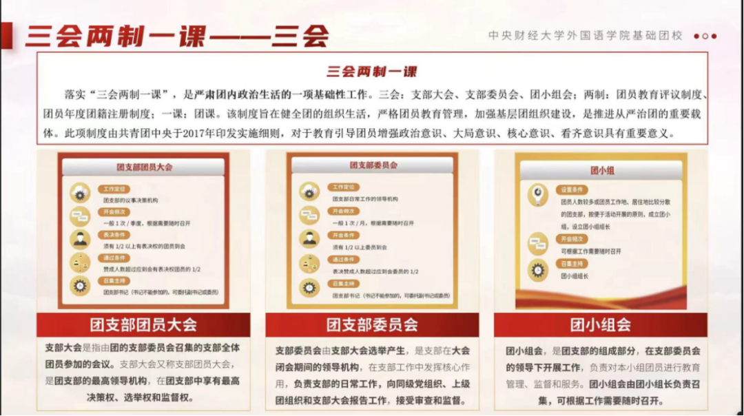 在团务培训环节,杨宇昊导师重点讲解了“三会两制一课”制度,具体包括支部大会、支部委员会、团小组会的职能分工,以及团员教育评议与年度团籍注册制度的实施要点。他还现场演示“北京共青团”线上系统的核心功能,涵盖团员信息管理、组织生活录入、团干部职务设置等常用操作,帮助团支委提升工作效率与规范性。