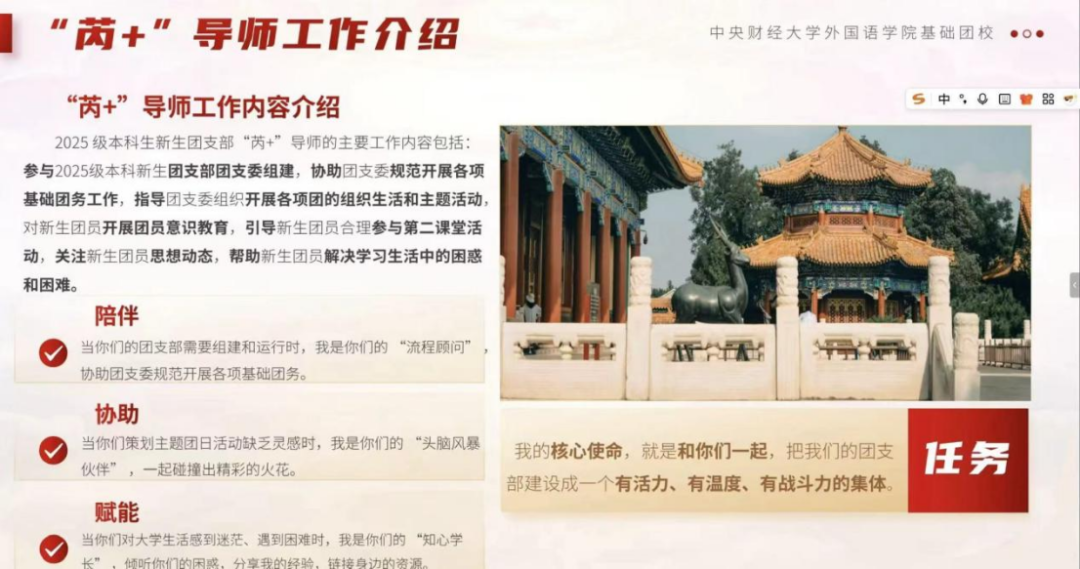 2025年11月1日,外国语学院2025级“芮+”导师启航计划暨基础团校开幕式于线上顺利举行。本次开幕式由学院组织部统筹组织,2025级“芮+”导师杨宇昊担任主讲,2025级全体本科生共同参与,为新学年团校工作拉开序幕。