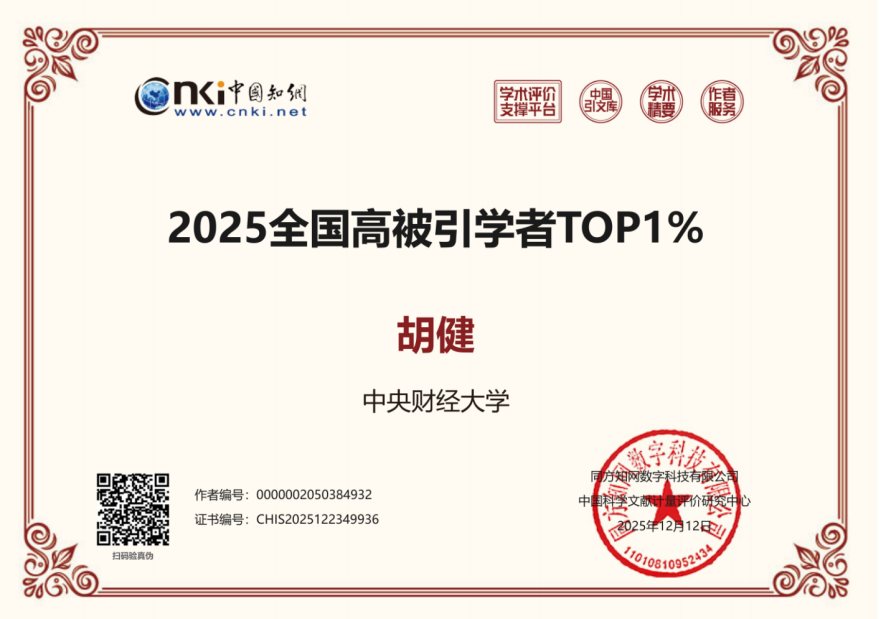 近日,中国知网的中国科学文献计量评价研究中心公布了“2025全国高被引学者”名单,我院胡健博士入选“2025全国高被引学者Top1%”。