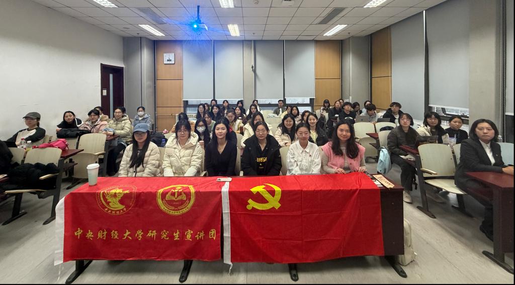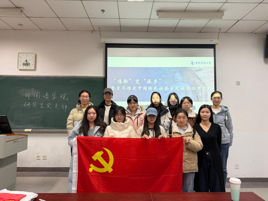 2025年11月26日,为深入学习贯彻习近平新时代中国特色社会主义思想,全面落实党的二十届四中全会精神,外国语学院研究生党支部与社会与心理学院社会学系研究生党支部、心理学系研究生党支部合共建,邀请我校研究生宣讲团聚焦“财经报国”使命,带来《“煤都”变“旅乡”:坚定不移走中国特色社会主义社会治理之路》专题宣讲。