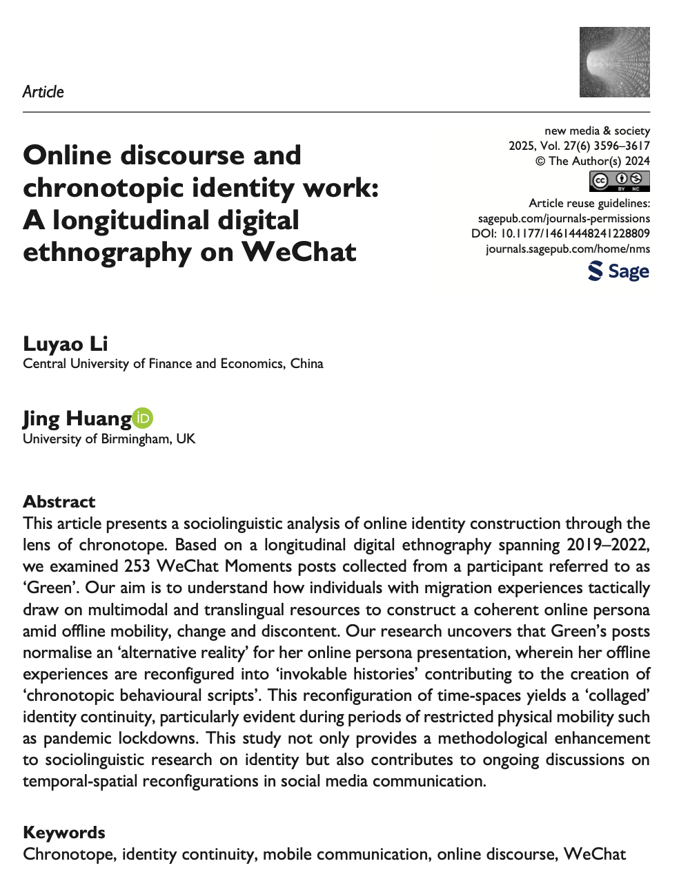 2025年6月,我院李璐遥老师(第一作者)的论文Online Discourse and Chronotopic Identity Work: A Longitudinal Digital Ethnography on WeChat正式发表于New Media & Society。该期刊是社会科学引文索引(SSCI)核心来源期刊,在传播学领域享有极高的学术声誉,其5年影响因子6.4,在全球传播学类期刊中排名前 5.3%(百分比排名 94.7%)。在我校期刊定级体系中属于最高级别的AAA类期刊,代表其在数字社会研究领域的权威地位。