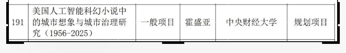 2025年12月3日,经公示北京市社科联及北京市社科规划办正式公布了本年度北京市社会科学基金项目立项名单。我院霍盛亚副教授主持课题《美国人工智能科幻小说中的城市想象与城市治理研究(1956-2025)》获得一般项目立项,这是霍盛亚老师自2014年获批我校首个外国文学方向国家社科青年项目后再次实现我校外国文学方向北京市社科基金项目零的突破。