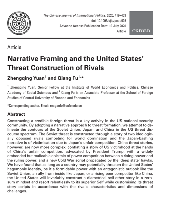近日,我院傅强教授与中国社会科学院大学袁正清教授于2020年合作发表的论文《Narrative Framing and the United States’ Threat Construction of Rivals》荣获第十二届中国社会科学院优秀科研成果奖二等奖。此次获奖是我院在高水平优秀科研成果奖方面取得的历史性突破,也是对我院持续推进国别区域交叉学科研究、不断提升科研创新能力所取得成效的充分肯定。