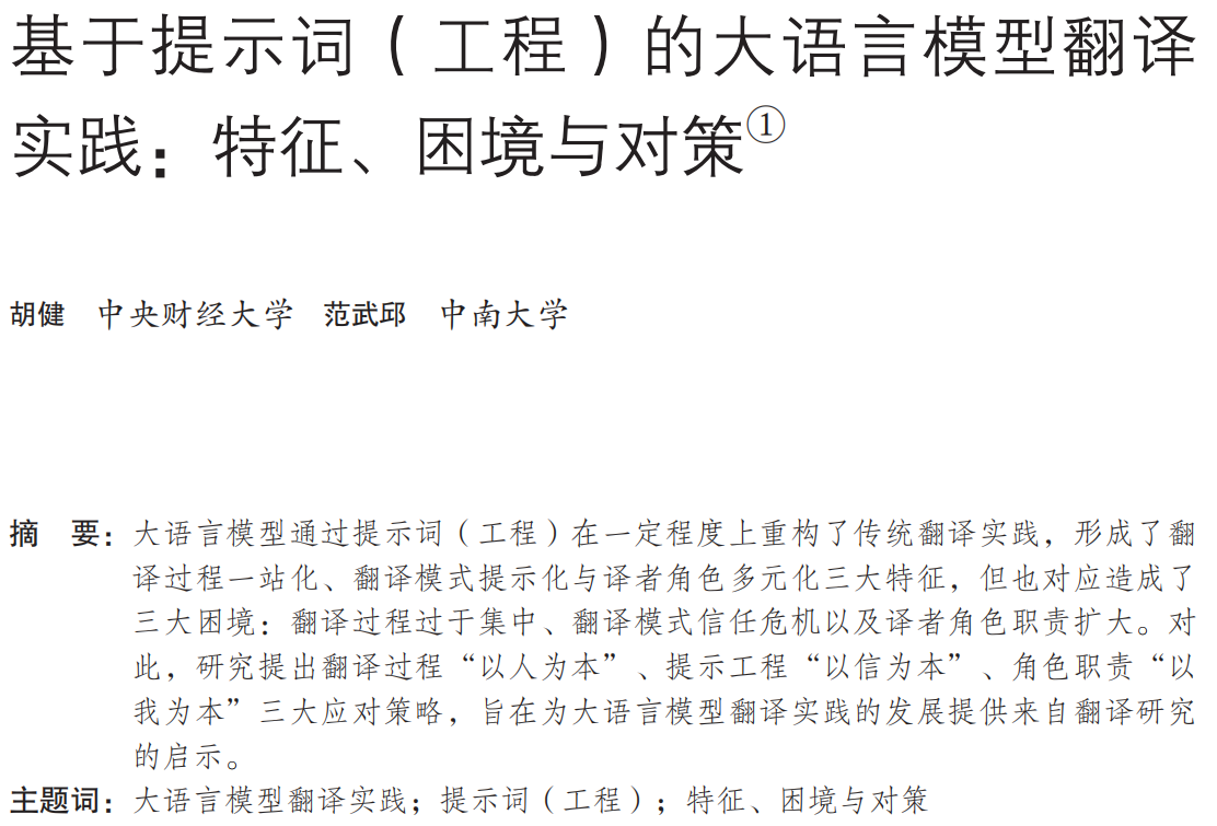 胡健,范武邱,“基于提示词(工程)的大语言模型翻译实践:特征、困境与对策”,《中国外语》,2026年第2期,第90-96页。